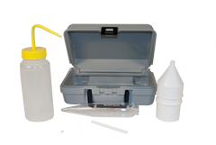 The sand content kit consists of a special 200-mesh sieve 2½ inches in diameter, fastened inside a collar upon which a small funnel is fitted on either end. This is used with a 10 ml glass measuring tube, graduated to read from 0 to 20% the percentage sand by volume. The collar and funnel are made of polyethylene and the screen is made of brass. A 500ml wash bottle and carrying case are included.